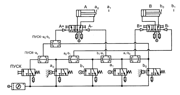 Заметим, что правые части 2-го и 4-го уравнений одинаковы, значит, при появлении комбинации сигналов а1 • b0 выдвижение штока цилиндра В и втягивание штока цилиндра А будут происходить одновременно. Но функционирование системы подобным образом недопустимо, поскольку при этом не обеспечивается требуемый порядок выполнения рабочих операций.