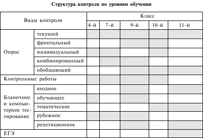 Научно–практический опыт проведения в школах различных видов массового независимого тестирования учащихся позволяет предложить двухпараметрические модели структур контроля, условно представляя возможные объемы тестирования в общей системе контроля, возможные сроки проведения тестового контроля, его иерархические уровни. В таких моделях площади прямоугольников условно задают долевой вклад и соотношение возможностей различных видов традиционного контроля и тестирования в образовательном процессе. Фоном выделены рекомендуемые виды и объемы обучающего контроля, которые могут изменяться в зависимости от конкретных условий обучения (табл. 9).