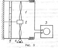 акрепленная в двух точках струна (рис. 3) своей средней частью находится между плюсами постоянного магнита 2. Подведение к струне переменного напряжения от звукового генератора 3 вызывает появление в ней переменного тока. Взаимодействие переменного магнитного поля струны с полем постоянного магнита приведет к появлению в струне вынужденных поперечных колебаний, частота которых равна частоте установленной на лимбе звукового генератора,