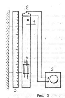 Блок-схема установки показана на рис. 3. Стоячая звуковая волна устанавливается в стеклянной трубе 1. Возбуждение волны осуществляется датчиком 2 электромагнитного типа, питаемого от звукового генератора 3. Плавное изменение длины трубы осуществляется поршнем 4, приводимым в движение специальной системой перемещ