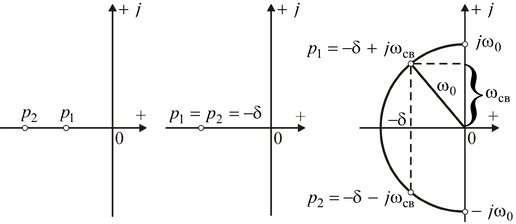 Корни характеристического уравнения располагаются симметрично относительно действительной оси в левой полуплоскости, рис. 8.13, в. Величина