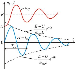 Полученное выражение показывает, что в цепи возникают затухающие синусоидальные колебания, причем огибающими кривой тока служат кривые