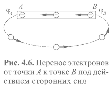 Для того, чтобы создать в проводнике AB постоянный ток, нужно от точки A непрерывно отводить поступающие в нее электроны и перемещать их в точку B. Осуществить такой перенос за счёт сил электростатического поля невозможно, поскольку