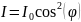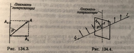 – угол между плоскостью колебаний падающего света и плоскостью поляризатора. Следовательно, колебание, параллельное плоскости поляризатора, проходит через него и несёт с собой от падающей волны долю интенсивности