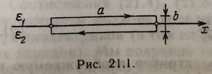 Выберем на этой поверхности произвольно направленную ось x. Возьмём небольшой прямоугольный контур длины a и ширины b, который частично проходит в первом диэлектрике, частично – во втором. Ось x проходит через середины сторон b.