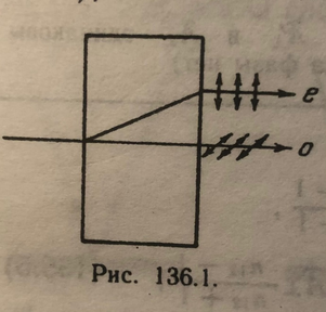 ), в частности он лежит в одной плоскости с падающим лучом и нормалью к преломляющей поверхности. Такой луч называется обыкновенным и обозначается буквой «о». Для другого луча называемого необыкновенным (обозначается буквой «е»), отношение синусов угла падения и угла преломления не остаётся постоянным при изменении угла падения. Даже при нормальном падении света на кристалл необыкновенный луч отклоняется от нормали.