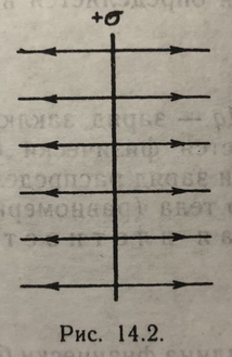 Из соображений симметрии, напряжённость поля в любой точке имеет направление, перпендикулярное к плоскости, так как плоскость бесконечно и однородно заряжено, то нет поводов для отклонения. В симметричных относительно плоскости точках напряжённость поля одинакова по величине и противоположна по направлению.