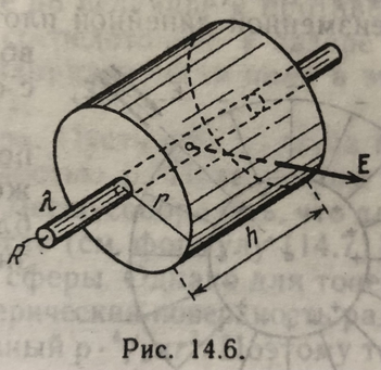. Из соображений симметрии следует, что напряжённость поля в любой точке должна быть направлена вдоль радиальной прямой, перпендикулярной к оси цилиндра, а величина напряжённости может зависеть только от расстояния r от оси цилиндра. Представим коаксиальную с заряженной поверхностью замкнутую цилиндрическую поверхность радиуса r и высоты h: