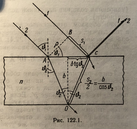 учесть возможность изменения фазы волны при отражении. В точке C отражение происходит от раздела границы среды, оптически менее плотной. Поэтому фаза волны претерпевает изменение на
