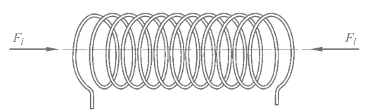 Токи в витках текут параллельно друг другу, следовательно, согласно закону Ампера, витки соленоида притягиваются друг к другу, то есть на соленоид вдоль его оси действуют стягивающие силы