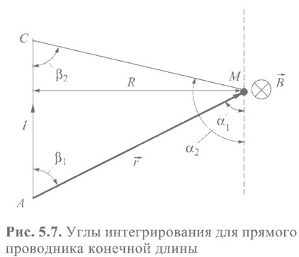 магнитного поля, создаваемого выделенным элементом тока в точке M направлен от наблюдателя перпендикулярно плоскости рисунка. Такое же направление имеют векторы индукции