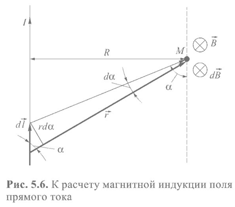 Магнитное поле прямого тока. Определим индукцию магнитного поля в точке M, отстоящей на расстоянии R от тонкого прямого проводника бесконечной длины с током