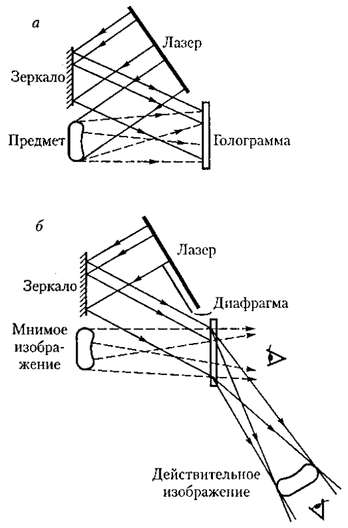 Для восстановления изображения рис. б голограмма помещается в то же самое место где она находилась до регистрации. Её освещают опорным пучком того же лазера (вторая часть лазерного пучка перекрывается диафрагмой).