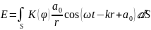 – фаза колебания в месте расположения волновой пов – ти S, k – волновое число, r – расстояние от элемента пов – ти dS до т. P. Множитель a0 определяется амплитудой светового колебания в том месте, где dS. Коэф. K зависит от угла