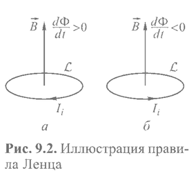 где S – поверхность ограниченная контуром. При этом токи, возникающие при увеличении магнитного потока и при его ослаблении, имеют противоположные направления.