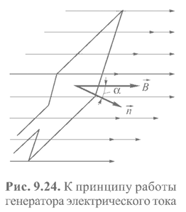 Генератор переменного тока. Принцип работы генераторов электрического тока основан на использовании явления электромагнитной индукции. Для этого рассмотрим проводящую рамку, вращающуюся в однородном магнитном поле с угловой скоростью