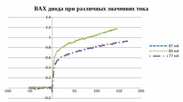 ВАХ диода в режиме закона трех вторых (I = 87 мА)
