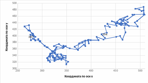 Р ис 2. Траектория броуновской частицы. Количество смещений n = 124.