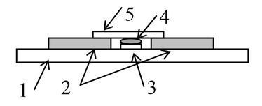Рис. 1. Кювета с жидкостью. 1 – стеклянная подложка, 2 – опорные полосы, 3 – прямоугольное основание микрокюветы, 4 – капля раствора.