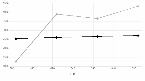Мной твердо установлены молярные теплоемкости латуни при различных температурах. С(500)=38,9; С(400)=12,6; С(600)=36,4; С(700)=43,2.