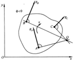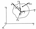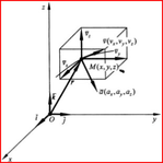 | Вопрос 5: Криволинейные координаты. Координатные линии и оси. Устанавливают закон выбора 3 чисел q1, q2, q3 – криволинейные координаты (обобщенные координаты). Функция координат: r=r(q1,q2,q3) (из точки О). Возьмем точку М0 с координатами q1,q10,q20. X=X(q1,q20,q30); Y=Y(q1,q20,q30); Z=Z(q1,q20,q30); r=r(q1, q2, q3) q=q(t) Определяют кривую (переменная только q1). Кривая – координатная линия, соответствующая изменению q1 (аналогично q2 и q3). Касательные к координатным линиям, проведенные в точке M0 в сторону возрастания соответствующих координат – координатные оси: [q1], [q2], [q3]. Вдоль каждой из координатных линий изменяется только одна криволинейная координата, а две другие сохраняют постоянные значения, соответствующие рассматриваемой точке. H1=|∂r/∂q1|=sqrt( (∂x/∂q)^2+(∂y/∂q)^2+(∂z/∂q)^2)- kоэффициент Ламе. e1=(∂r/∂q1)/H1. Аналогично Н2, Н3, е2, е3. | Вопрос 6: Скорость точки в криволинейных координатах. При движении точки ее радиус вектор через обобщенные координаты зависит от времени: r=r[q1(t),q2(t),q3(t)] V=dr/dt=(∂r/∂q1)∙dq1/dt+(∂r/∂q2)∙dq2/dt+(∂r/∂q3)∙dq3/dt. (qi)’=dqi/dt – обобщенная скорость точки. v=(dq1/dt)H1e1+(dq2/dt)H2e2+(dq3/dt)H3e3. v=√(dq1/dt)²H1²+(dq2/dt)²H2²+(dq3/dt)²H3². vq1=(dq1/dt)H1, vq2=(dq2/dt)H2, vq3=(dq3/dt)H3. Пример: 1) скорость в цилиндрической системе. Т.к. x=ρcosφ, y=ρsinφ, z=z, то H1=1, H2=ρ, H3=1. vρ=dρ/dt, vφ=ρdφ/dt, vz=dz/dt. 2) Движение по винтовой. ρ=R=const, φ=kt, z=ut. vρ=0, vφ=kR, vz=u. | Вопрос 7: Поступательное движение твердого тела. Траектории, скорости и ускорение точек тела. Существует 5 видов движения – поступательное, вращательное вокруг неподвижной оси, плоское (плоскопараллельное), сферическое, общий случай. Поступательное движение твердого тела – движение, при котором любая прямая этого тела при движении остается параллельной самой себе. Траектории, скорости и ускорения любой точки тела, совершающего поступательное движение, одинаковы. Радиус – вектор любой точки движущегося поступательно тела равен rB=rA+AB, AB=const. drB/dt=drA/dt+ dAB/dt=drA/dt =>vB=vA, aB=aA. Мгновенное поступательное движение – движение твердого тела, для которого векторы скоростей точек равны только в один момент времени. Поступательное движение полностью характеризуется движением одной точки тела: x=f1(t); y=f2(t);z=f3(t); | Вопрос 8: Вращение твердого тела вокруг неподвижной оси. Скорости и ускорение точек тела. Вращение твердого тела вокруг неподвижной оси – такое его движение, при котором две точки тела остаются неподвижными в течении всего времени движения. φ=φ(t) – угол поворота, n=1 степень свободы. Для задания вращения вокруг неподвижной оси необходимо выбрать ось, начало отсчета угла поворота и его положительное направление и задать зависимость угла поворота от времени. ω=dφ/dt – угловая скорость(рад/с). ε=dω/dt= d²φ/dt² - угловое ускорение(рад/с2). Скорость любой точки тела, не лежащей на оси v=ωxr, ускорение a=dv/dt=(dω/dt)xr+ ωxdr/dt=εxr+ωx(ωxr), где aτ=εxr. Tga=|at|/an=E/ω2 – угол между полным ускорение и радиусом вращения. Скорость точек тела при вращении вокруг неподвижной оси пропорциональны их кратчайшим расстояниям до этой оси. U=h*ω – модуль скорости точки. Частные случаи: 1) ω=const – равномерное вращение (φ=φº+ωt ). 2) ε=const – равноускоренное вращение (ω=ωº+εt, φ=φº+ωt+ εt²/2). |