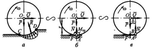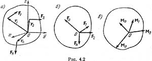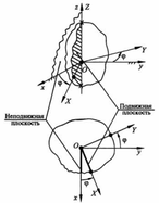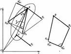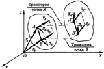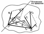 | Вопрос 24: Ускорение Кориолиса. Правило Жуковского. Кинематическая теорема Кориолиса: абсолютное ускорение точки является векторной суммой трех ускорений - относительного, переносного и ускорения Кориолиса. Ускорение Кориолиса равно удвоенному векторному произведению угловой скорости переносного движения на относительную скорость точки: , следовательно по модулю ускорение Кориолиса: (sin90=1). Кориолисово ускорение обращаетсяв нуль, когда: 1) переносное движение - поступательное, т.е. омега переносное равно нулю; 2) в те моменты времени, когда в относительном движении точка останавливается, например.при изменении направления относительного движения. Частные случаи: А) ω0 – смена знака Б) vr0 – относительный покой (смена знака движения). В) sin(ω,vr)0, ω||vr. Правило Жуковского: Кориолисово ускорение можно получить, спроецировав вектор радиальной скорости на плоскость, перпендикулярную вектору омега переносное, увеличив полученную проекцию радиальной скорости в 2*(омега переносное) раз и повернув ее на 90 градусов в направлении переносного вращения. | Вопрос 25: Сложное вращение твердого тела вокруг пресекающихся осей. В случае вращательных относительного и переносного движений твердого тела, когда оси их вращений пересекаются в точке О (рис. 7.2), абсолютное движение будет движением твердого тела вокруг неподвижной точки О (сферическим движением) с угловой скоростью, определяемой согласно Нетрудно убедиться, что скорости всех точек, лежащих на линии, по которой направлен вектор угловой скорости, равны нулю. В самом деле, например, скорость находящейся на этой линии точки А тела (по свойству произведения коллинеарных векторов "омега" и r). Таким образом, прямая, на которой расположен вектор угловой скорости, является мгновенной осью вращения тела. Скорость любой точки М тела в данном случае можно определить так: или , где Модули составляющих, а также абсолютной скорости точки М равны модулям соответствующих векторных произведений и могут быть вычислены по формулам: , где - кратчайшие расстояния от точки М до соответствующих осей вращения. | Вопрос 26: Сложное вращение твердого тела вокруг параллельных осей. Если оси вращательных движений тела параллельны, то вектор результирующей угловой скорости ω тела в неподвижной системе координат будет коллинеаренωе и ωr. Положение мгновенной оси вращения тела как оси, проходящей в данный момент времени через точку Р – МЦС в плоскости П, перпендикулярной осям вращений, можно определить из анализа: vrP=ωr×OrP, veP=ωe×OeP, Or, Oe – точки пересечений П с соответствующими осями вращения. vP=veP+vrP=0veP= -vrPveP= vrPωrOrP=ωeOeP. В зависимости от взаимного расположения и численного значения векторов ωr и ωe можно выделить 3 случая сложения вращательных движений: А) При совпадении направлений векторов ωe и ωr абсолютное движение будет плоским. Абсолютная угловая скорость в этом случае будет иметь направление, совпадающее с направлениями её составляющих, а её модуль ω=ωr+ωe. Положение точки Р можно найти из пропорции ωe/OrP=ωrOeP=ω/OeOr. Скорость любой точки тела может быть найдена по формуле v=ω×PM. Б) При противоположных направлениях векторов ωe и ωr, когда ωr≠ωe, абсолютное движение будет плоским. Абсолютная угловая скорость имеет направление, совпадающее с направлением большей по модулю составляющей угловой скорости, а её модуль ω=|ωr-ωe|. Про