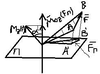 | Вопрос 32: Момент силы относительно оси. Момент силы относительно оси – алгебраический момент проекции этой силы на ось, перпендикулярную оси z, взятого относительно точки A пересечения оси с этой плоскостью. Характеризует вращательный эффект относительно оси. Mz(F)=2SΔABC=F┴∙h. Если Mz(F)=0, то сила F либо параллельна оси z, либо линия её действия пересекает ось z. Второе правило определения момента силы относительно оси: Момент силы относительно оси называется произведение проекции силы на плоскость перпендикулярную оси на плечо этой проекции относительно точки пересечения плоскости с осью. Момент силы относительно оси Z: M0z(F) = ±hп * Fп Частные случаи: момент силы относительно оси = 0. а) Fп = 0 б) hп = 0 (сила пересекает ось) Момент силы относительно оси = 0, если сила и ось находятся в одной плоскости. Момент сил относительно декартовых осей координат (проекции момента силы на эти оси). | i j k | M0(F) = r * F = | x y z | = (y*Fz - z*Fy)*i + (z*Fx - x*Fz)*j + (x*Fy - | FxFyFz | y*Fx)*k = Mox(F)*i + Moy(F)*j + Moz(F)*k Mox(F)=y*Fz - z*Fy Moy(F)=z*Fx - x*Fz Moz(F)=x*Fy - y*Fx | Вопрос 33: Связь векторного момента силы относительно точки с моментом силы относительно оси, проходящей через эту точку. Момент силы F относительно оси z равен проекции на эту ось вектора момента силы Fотносительно произвольной точки О на этой оси. Доказательство: Пусть О – произвольная точка на оси z. Момент силы F относительно точки О перпендикулярен плоскости ОАВ MO(F)┴(OAB). Пусть угол междуMO(F) и осью z равен α. Тогда ПрzMO(F)=2SΔO’A’B’= 2SΔOAB∙cosα =>Mz(F) = |MO(F)|cosα. Ч.т.д. 2*S(OA'B') = 2*S(OAB)*cosα | Moz(F) | = | Mo(F) |*cosα MCOO = проекции на эту ось векторному МСОТ | Вопрос 34: Аналитические выражения для моментов силы относительно осей координат. Используя связь момента силы относительно оси с векторным моментом силы относительно точки на оси, можно получить формулы для вычисления моментов относительно осей координат, если даны проекции силы на оси координат и координаты точки приложения силы. i j k MO(F)= xAyAzA=> FxFyFz -