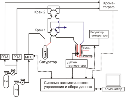 Система хроматографического анализа выполнена на базе модифицированного хроматографа «ЛХМ-8мд». Система коммуникаций состоит из двух 6-ходовых кранов. Кран 1 позволяет выбрать объект анализа: исходная реакционная смесь (ИРС) или конечная реакционная смесь (КРС). Кран 2 является краном-дозатором и служит для ввода пробы в хроматограф.