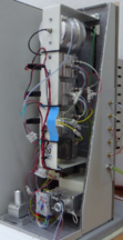 | Рис. 8.3. Вид установки с лицевой стороны. Слева под защитным кожухом находится проточный реактор. Виден регулятор температуры, ниже его расположены две водяные ловушки, которые стоят на выходе газовых потоков | |