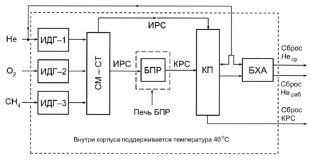 Состав ИРС: 1 % метана, 10 % кислорода, 89 % гелия (задаётся персоналом и не изменяется в ходе работы).