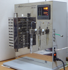 Справа вверху находится регулятор/измеритель температуры печи. В средней части находятся две водяные ловушки, правая ловушка служит индикатором процесса отбора пробы, через левую ловушку происходит сброс КРС.