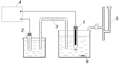 Рис. 1.3. Установка для потенциометрического титрования: 1 – ионоселективный электрод; 2 – электрод сравнения; 3 – солевой мостик2; 4 – иономер; 5 – микробюретка; 6 – якорёк магнитной мешалки. Микробюретка имеет объём 5 мл и заполнена раствором АgNО3