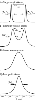 Точная зависимость ширины линии от скорости обмена может быть получена путём решения уравнений Блоха, описывающих поведение макроскопической намагниченности образца в магнитном поле. При обмене химически эквивалентных групп между двумя положениями выражение для формы линии может быть представлено в следующем виде: