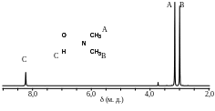 Наличие двух сигналов связано с тем, что внутримолекулярный обмен положениями между метильными группами A и B происходит с низкой частотой и время пребывания метильных групп в цис- и транс-положениях по отношению к карбонильной группе достаточно велико в шкале времени ЯМР. Поскольку протоны этих групп находятся в различном химическом окружении, то в спектре 1H ЯМР присутствуют два сигнала с разными значениями химического сдвига.