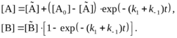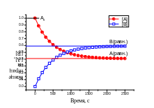 Пусть в начальный момент времени в системе присутствует только вещество А, его начальная концентрация равна [A0], начальная концентрация вещества B равна нулю. В любой момент времени справедливо уравнение материального баланса