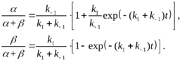 Эти выражения легко написать, просто глядя на кинетические кривые, показанные на рис. 2.6. Конечно, из рисунка не следует, что в экспоненте стоит сумма констант скорости прямой и обратной реакции. С другой стороны, трудно придумать простую комбинацию констант скорости прямой и обратной реакции, куда эти константы входят симметричным образом и обеспечена нужная размерность.