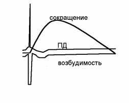 2-24. Схема соотношения потенциала действия, кривой возбудимости и кривой сокращения скелетной мышцы выглядит так: