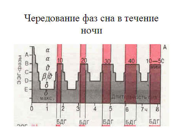 В настоящее время показано, что период бодрствования сменяется стадией медленного сна, которая длится 60-90 минут и переходит в стадию быстрого сна (5-10 минут). Затем снова наступает медленный сон. Так они сменяют друг друга в течение ночи, причем постепенно падает глубина ФМС и растет длительность ФБС. Таким образом, структура сна может быть выражена так:
