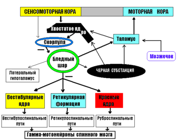 Моделью работы рано созревающего и еще не контролируемого корой паллидарного комплекса являются беспорядочные, нецеленаправленные движения бодрствующего ребенка первых месяцев жизни. С развитием коры все активные движения в основном начинают регулироваться ею — возрастают их координированность, точность, логическая упорядоченность, появляется согласованность кинетических фрагментов с конечным результатом. Поражения подкорковой части экстрапирамидной системы приводят к патологии двух родов — к динамическим нарушениям (собственно движений) и статическим нарушениям (позы).