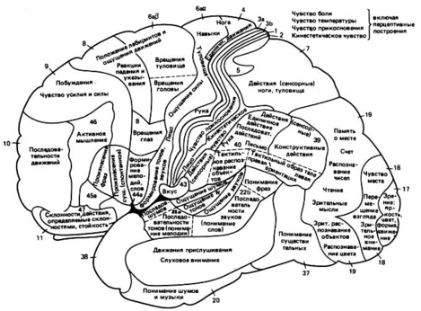 Первыми получили многие сведения о локализации функций в коре мозга морфологи и клиницисты. Морфологи показали, что цитоархитектоника коры изменяется не только по вертикали, но и по горизонтали. Это значит, что в разных участках коры она имеет специфическое строение. Морфологические особенности строения различных отделов коры мозга позволили разделить ее на несколько зон (карта Бродмана - 50 полей). Клиницисты доказали, что у человека многие участки коры больших полушарий имеют строго локализованные функции. Так, в области третьей левой лобной извилины расположен участок, относящийся в функции речи, в височной доле - центр слуха, в затылочной - зрения. Однако, в силу большой пластичности мозга и за счет перекрытия границ специфических зон в случае повреждения даже больших участков мозга функции этих отделов постепенно могут восстанавливаться.