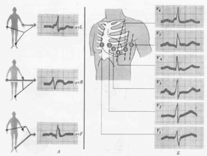Рис. 24. Слева - наложение электродов при стандартных отведениях электрокардиограммы (I—III) и формы ЭКГ, получаемых при этих отведениях. Справа - места наложения электродов при грудных отведениях электрокардиограммы (1—6) и формы ЭКГ, получаемых при этих отведениях. I—IV — межреберные промежутки