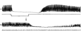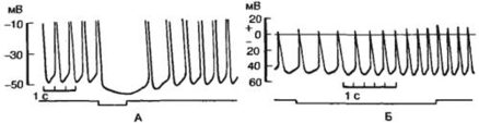 Рис. 27. Потенциалы действия клетки — водителя ритма сердца лягушки при раздражении блуждающего (А) и симпатического (Б) нервов.