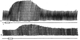 Химический механизм передачи нервных импульсов в сердце. При раздражении периферических отрезков блуждающих нервов в их окончаниях в сердце выделяется АХ, а при раздражении симпатических нервов — норадреналин. Эти вещества являются непосредственными агентами, вызывающими торможение или усиление деятельности сердца, и поэтому получили название медиаторов (передатчиков) нервных влияний. Существование медиаторов было показано Леви (1921). Он раздражал блуждающий или симпатический нерв изолированного сердца лягушки, а затем переносил жидкость из этого сердца в другое, тоже изолированное, но не подвергавшееся нервному влиянию — второе сердце давало такую же реакцию. Следовательно, при раздражении нервов первого сердца в питающую его жидкость переходит соответствующий медиатор. На нижних кривых можно видеть эффекты, вызываемые перенесенным раствором Рингера, находившимся в сердце во время раздражения.