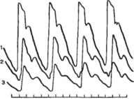 Рис. 32. Сфигмограммы сонной (слева). Справа - сфигмограммы бедренной (1), лучевой (2) и пальцевой (3) артерий, записанные синхронно.