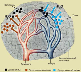 Рис. 34. Обмен веществ в пределах микроциркуляторного русла.
