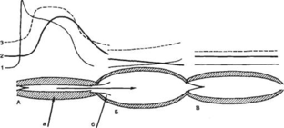 Рис.36. Механизм движения лимфы по лимфатическим сосудам (по Г. И. Лобову). А — лимфангион в фазе сокращенна; Б — лимфангион а фазе заполнения; В — лимфангион в состоянии покоя; а — мышечная манжетка лимфангиона: б — клапан; 1 — мембранный потенциал и потенциал действия миоцитов лимфангиона; 2 — сокращение стенки лимфангиона; 3 — давление в проекте лимфангиона. Стрелкой показано направление движения лимфы.