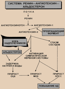 Под действием альдостерона увеличивается канальцевая реабсорбция натрия. За натрием по закону осмоса увеличивается реабсорбция воды. Таким образом, альдостерон способствует повышению в организме натрия и внеклеточной жидкости, т.е. способствует повышению АД. Ангиотензин в свою очередь является наиболее мощным стимулятором образования альдостерона. При активации ренин-ангиотензиновой системы содержанйе альдостерона в крови повышается.