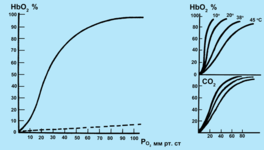 Кривая диссоциации оксигемоглобина. Реакция, отражающая присоединение кислорода к гемоглобину подчиняется закону действующих масс. Это означает, что соотношение между Hb и HbO2 зависит от содержания физически растворенного кислорода. Отношение количества оксигемоглобина к общему количеству гемоглобина (в %) в крови называется насыщением гемоглобина кислородом