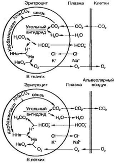Ионы НСО3– выходят в плазму, а вместо них в эритроцит поступают анионы хлора – так сохраняется электрический заряд клетки. По мере поступления СО2 образуются в эритроцитах и Н+. Однако это не приводит к сдвигу рН, так как оксигемоглобин более слабая кислота, чем угольная и может связать большее количество ионов Н+.