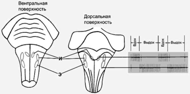 ис. 44. Локализация инспиратолрных (И) и экспираторных (Э) центров в продолговатом мозге. Изображены разряды нейронов этих центров в различные фазы дыхательного цикла.